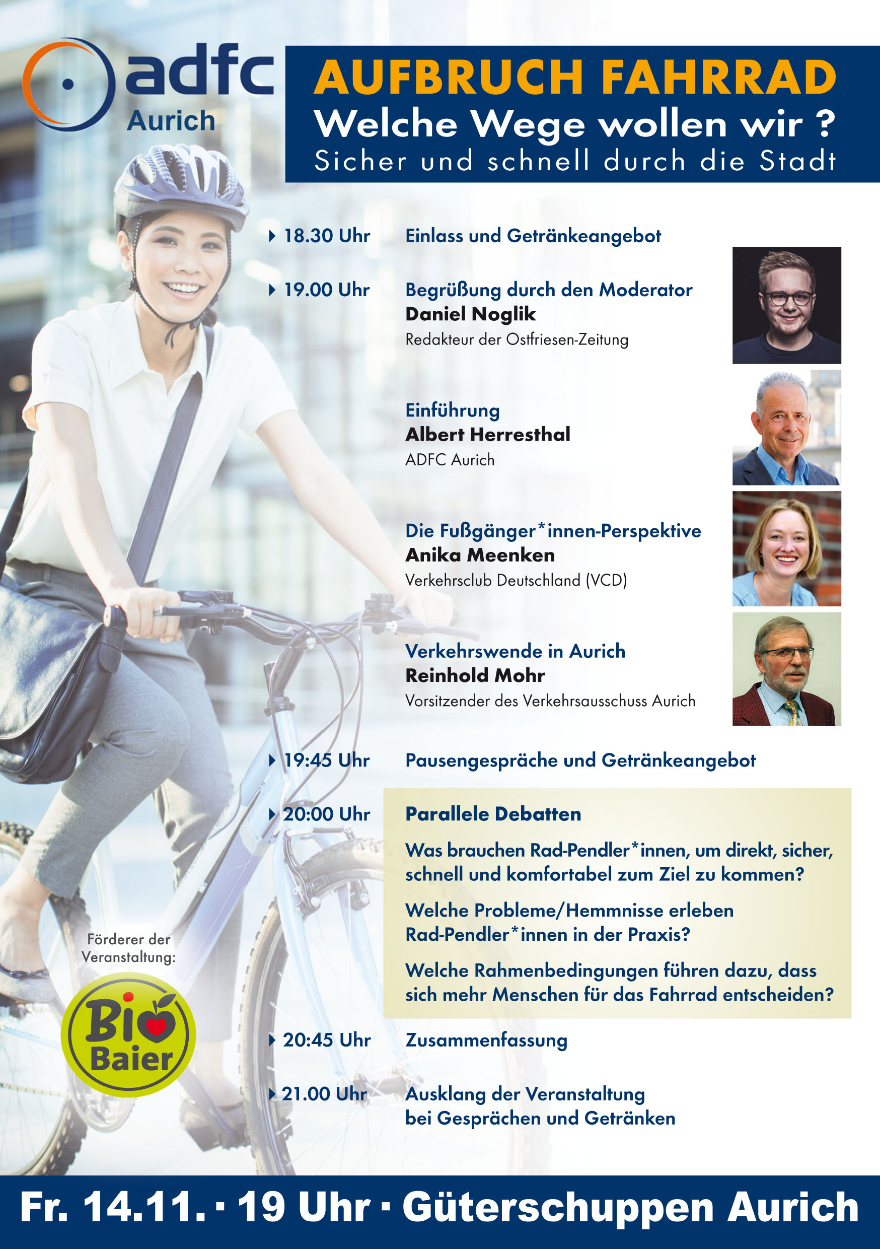 Um 19:00 startet das Programm mit der Begrüßung durch den Moderator Daniel Noglik. Anschließend führt Albert Herresthal vom ADFC Aurich in das aktuelle Thema ein. Es folgt Anika Meenken vom Verkehrsclub Deutschland (VCD) mit der Fußgänger*innen-Perspektive. Bernd Ewerth, Leiter des Tiefbauamtes der Stadt Aurich spricht über die geplanten und umgesetzten Maßnahmen. Und Reinhold Mohr, Vorsitzender des Verkehrsausschuss Aurich berichtet über die Verkehrswende in Aurich.